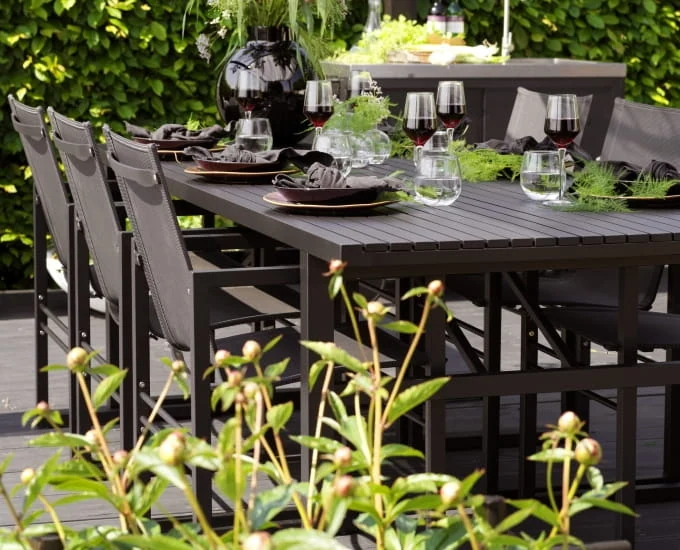 Stół Kordoba można połączyć z krzesłami i ławkami Kordoba, tworząc wygodą i elegancką strefę jadalnianą na tarasie.