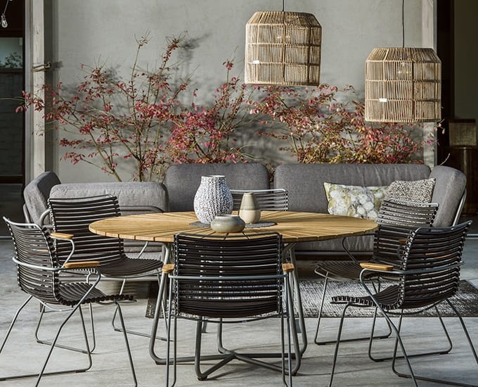 Stół Circle i krzesła Click sprawdzą się jako aranżacja tarasu w roli jadalnianej.