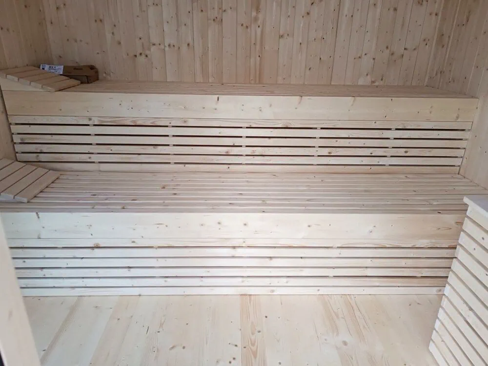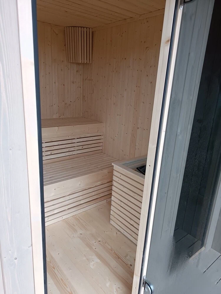- wyposażenie sauny: 2x ławka świerkowa z oparciami, 2 x zagłówek, 1x lampa porcelanowa z drewnianą osłoną, 1x drewniana osłona pieca, rekomendowany piec o mocy 9 kw