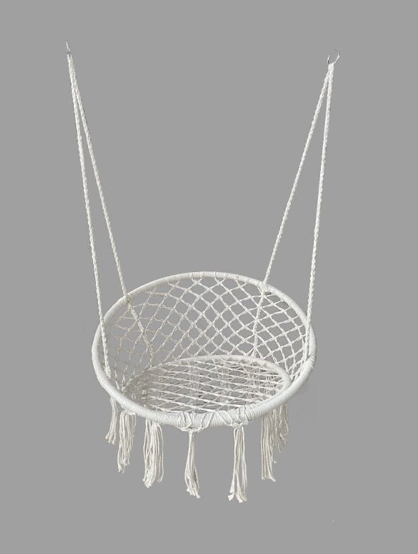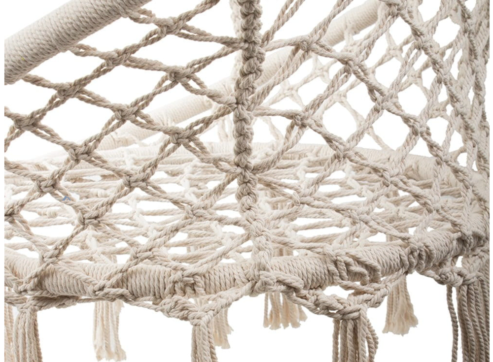 Rustykalny fotel wiszący Nido został wypleciony z mocnego sznurka w kolorze ecru. Zapewnia ona maksymalny komfort wypoczynku oraz gwarantuje bezpieczeństwo podczas użytkowania. Fotel można podwiesić na dwa sposoby – na prosto, jak i na krzyż, co daje nie tylko zróżnicowany efekt wizualny ale także wpływa na możliwości rozkołysania fotela.