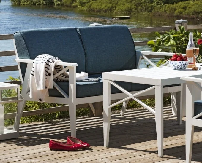 Design sofy, podobnie jak innych mebli z tej niezwykłej serii, jest zaskakujący i piękny – biała konstrukcja, o wyróżniającym się krzyżowaniu na oparciu, pochyłych, zwężających się nóżkach, została uzupełniona dużymi poduchami w kolorze morskim. Taki duet jest idealny na taras, gdzie będzie kojarzyć się z wakacjami i morskim wypoczynkiem.