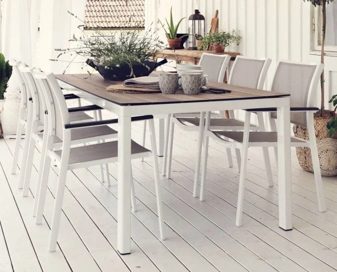 Stół Rodez podoła wszelkim wymaganiom, ponieważ jest funkcjonalny i odporny na warunki atmosferyczne oraz solidny. Stół został wykonany na ramie aluminiowej w kolorze białym i czarnym do wyboru. Blat stołu to trwały i odporny na zarysowania, uszkodzenia oraz wilgoć laminat HPL. Doskonale imituje drewno, będąc zarazem miłym w dotyku.