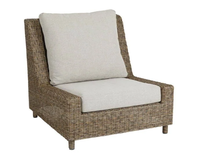 Technorattanowy fotel bez podłokietników Sandkorn wypełniają jasne, miękkie poduszki. Powleka je nowoczesna, wodoodporna tkanina Olefina, odporna na wilgoć oraz odbarwianie przez promieniowanie słoneczne. Jest również bezpieczna dla alergików, gdyż nie rozwijają się na jej powierzchni grzyby i pleśń. Jasna kolorystyka poduszek efektownie kontrastuje na tle brązowego technorattanu. W całej swojej okazałości mebel wygląda zachwycająco.